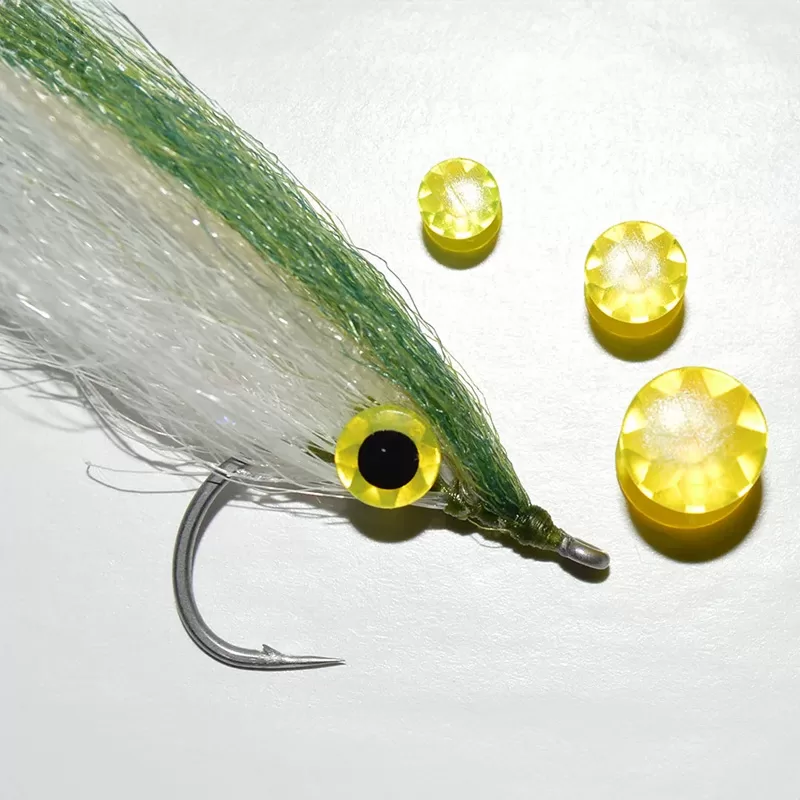 Diamond Fish Eyes eru hönnuð og framleidd í Danmörku frá upphafi til enda, með áherslu á gæði og endingargóða hönnun. Þessi flúrljómandi fiskiaugu úr fasettuðu plasti endurvarpa miklu ljósi og skapa áberandi fókuspunkt á flugunni – sem getur jafnvel dregið úr tökum í sporðinn.