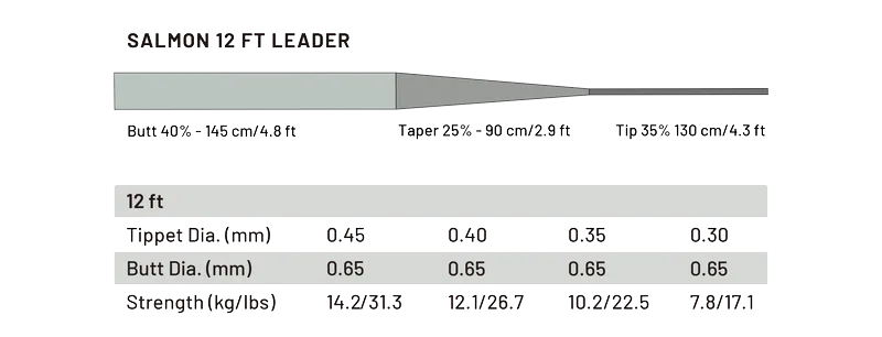 Butt-hlutinn er 0,65 mm að þvermáli og hentar vel með Spey línum og skothausum. Taperinn er hannaður til að skila stöðugri og áreiðanlegri yfirfærslu, jafnvel með stærri flugum.